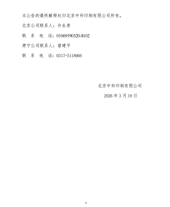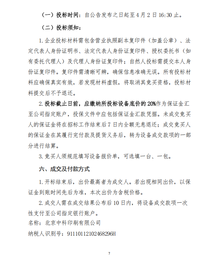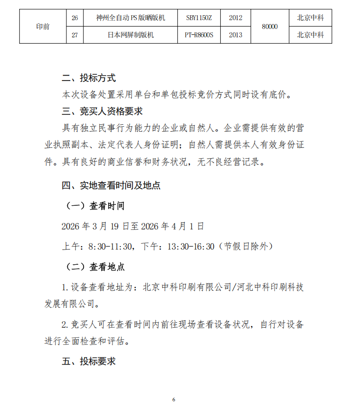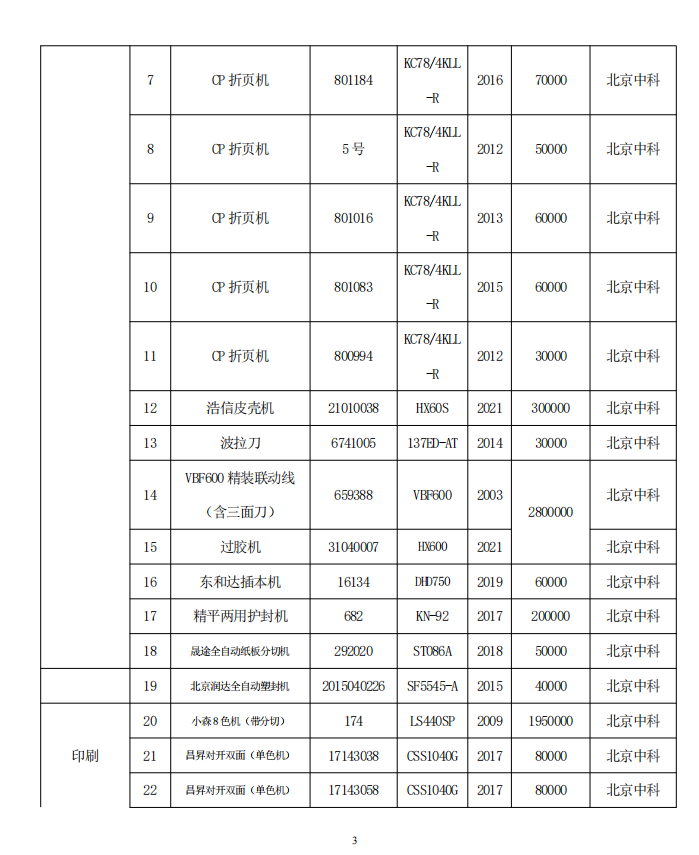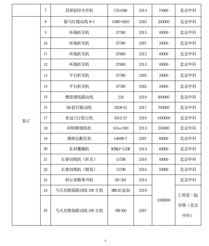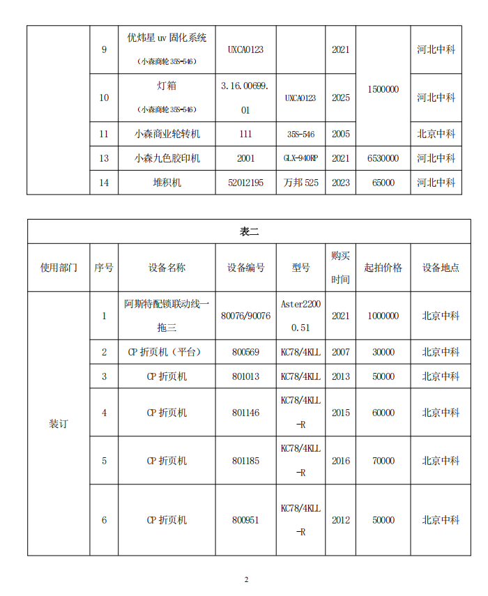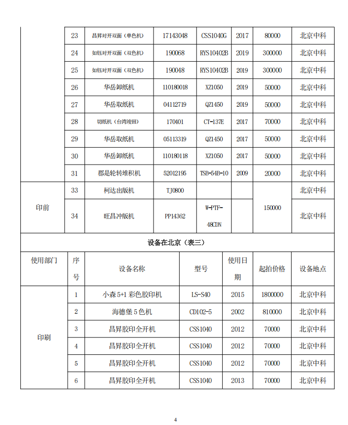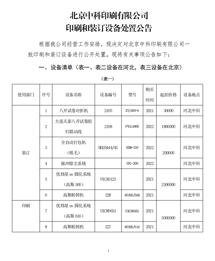 北京中科印刷有限公司 印刷和装订设备处置公告
