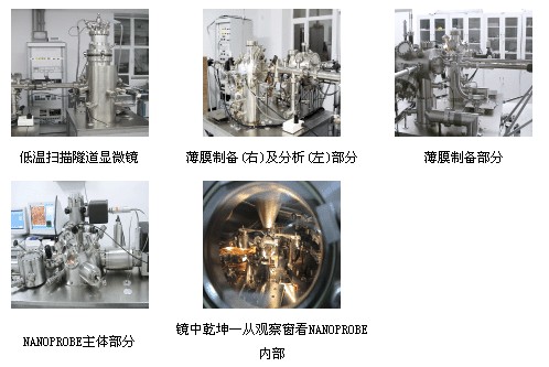 此组图是为中科院物理所引进的纳米探测-低温扫描隧道显微镜联合系统(NANOPROBE-LTSTM)。 该系统是我国自行设计的世界上第一台可原位研究体系的表面纳米结构、电子态结构与纳米体系电子输运性质的综合系统。系统由中科院物理所纳米物理与器件实验室设计、德国Omicron公司制作完成。