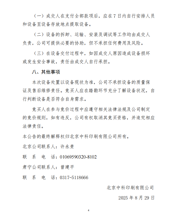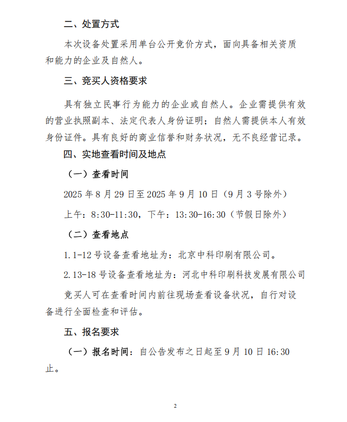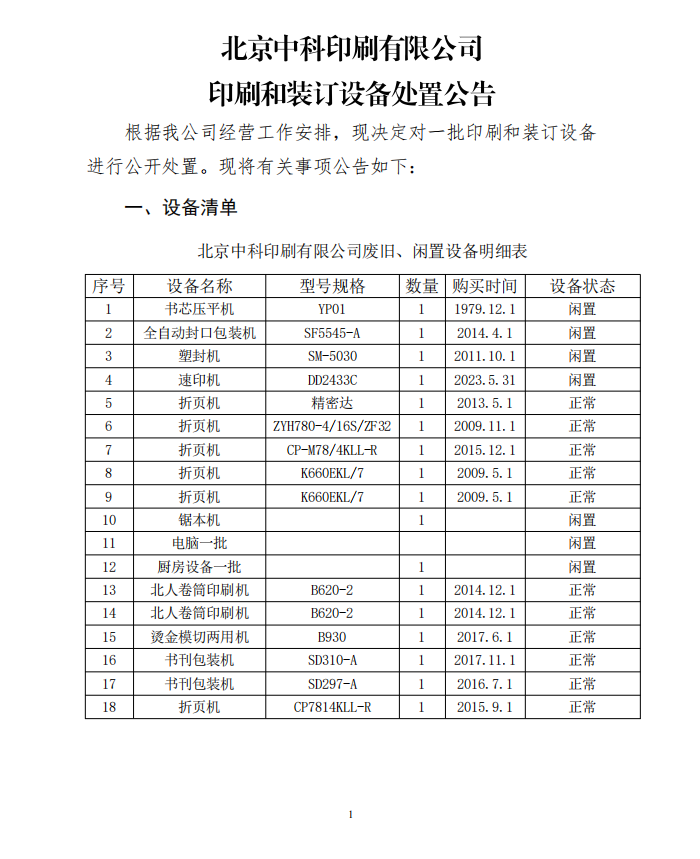 北京中科印刷有限公司 印刷和装订设备处置公告