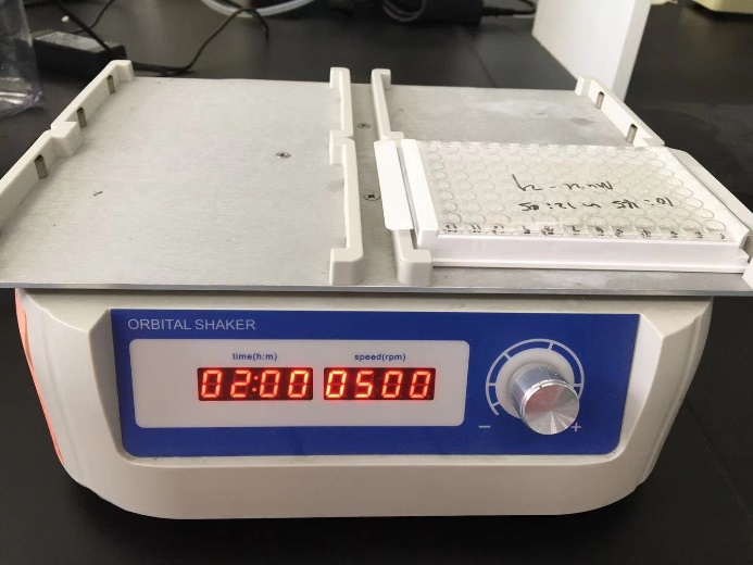 调整摇床速度,让液体剧烈振荡,使其几乎旋转到微孔板的顶部,但不能形成气泡或飞溅到封板膜上;
