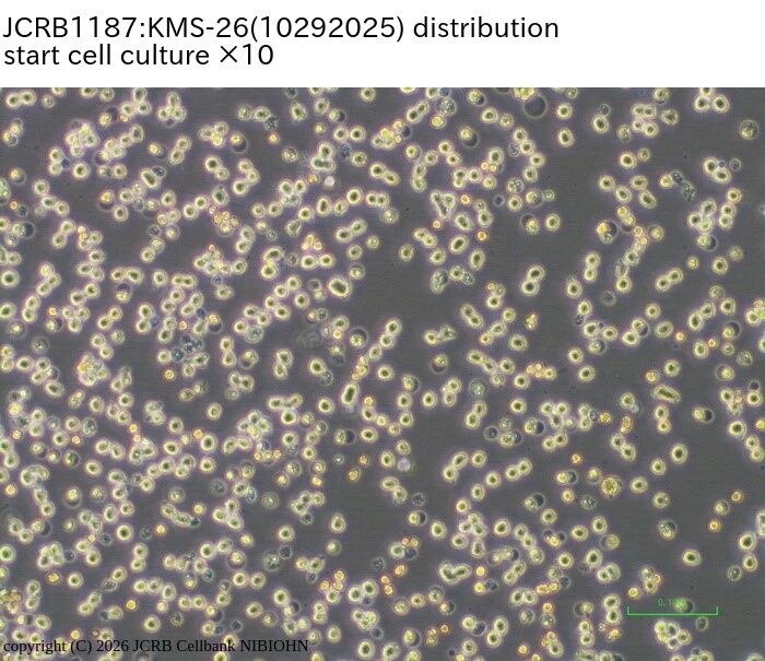 该细胞来源于一位50岁男性多发性骨髓瘤患者的胸腔积液。由日本川崎医科大学Otsuki, T.教授寄存至JCRB。KMS-26属于KMS系列骨髓瘤细胞系(KMS-12-BM、KMS-12-PE 、KMS-11、KMS-26等)的一员。