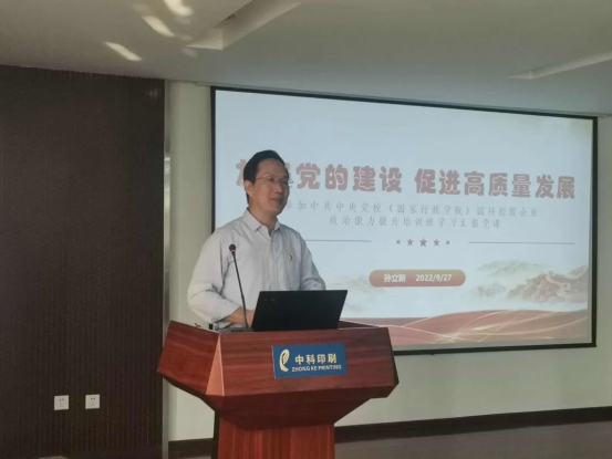 根据国科控股党委要求和北京中科印刷有限公司党委年度工作计划安排,2022 年 9月27日上午8点30分,公司党委书记孙立新同志以“加强党的建设,促进高质量发展”为题,将参加中央党校国科控股企业政治能力提升培训班学习内容、学习体会与公司实际紧密结合,为全体党员及...