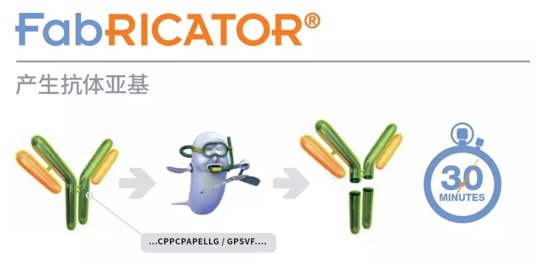FabRICATOR® (IdeS)is a unique cysteine protease that cleaves IgG at a single amino acid site below the hinge region. The digestion reaction can be completed in only 30 minutes, and no condition optimization is required.