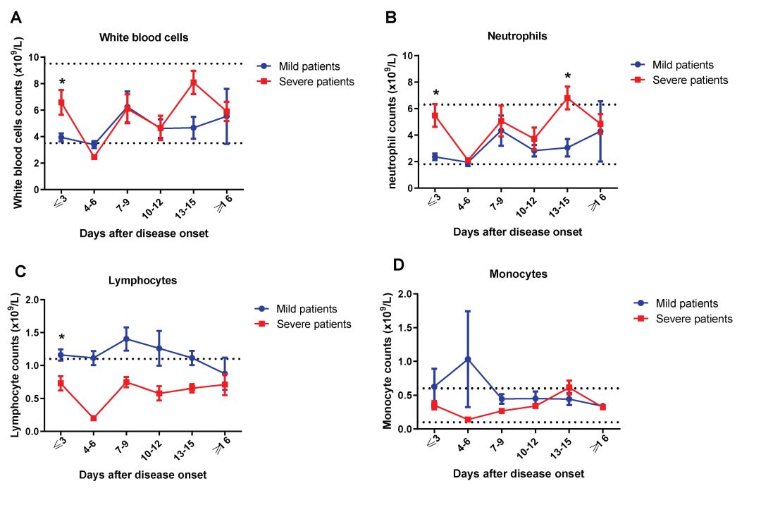 1. 重症患者入院时外周血淋巴细胞的绝对计数显著低于轻症患者,而白细胞和中性粒细胞的绝对计数明显高于入院时的轻症患者(下图)。