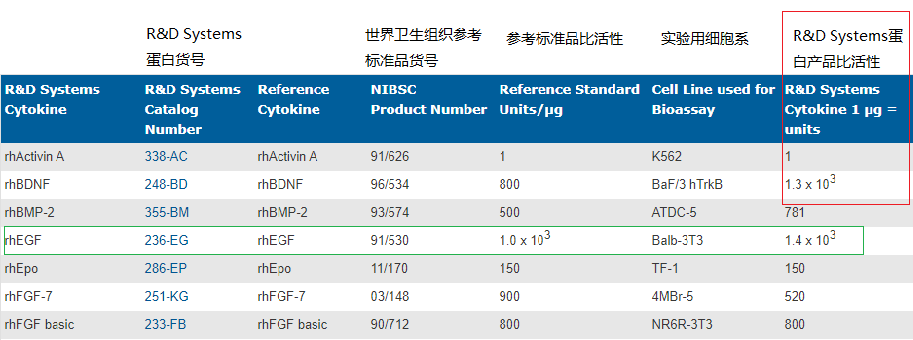 比如人 EGF 蛋白产品(货号 236-EG),1 μg=1.4*103 U,如果文献中所用的浓度为 100 U/mL,换算到该产品的质量浓度就是 100/1400=0.07 μg/mL。