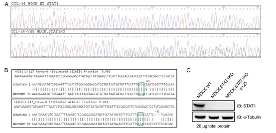 图2. STAT1-KO-MDCK 细胞特征。(A)MDCK.STAT1KO 细胞 STAT1 基因测序结果证实STAT1基因断裂。(B)测序结果显示,MDCK.STAT1KO 细胞是一个杂合子。一条等位基因存在单一碱基插入,另一个等位基因存在4碱基的缺失。(C)WB结果显示,无论是低代次还是高代次, MDCK.STAT1KO 细胞都没有 STAT1 蛋白表达。