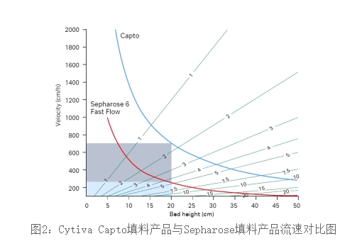 As shown in the figure above, the diameter of the loading column is 1m. Under the condition of 20℃, the water flow rate at different loading heights is different. The red and blue curves respectively represent the actual performance of different base fillers under pressure limits. This is due to the update of the new base, Capto packing has higher rigidity and lower back pressure than Sepharose packing, so Capto packing with higher column bed height can still achieve very good flow rates, and the more selective column height provides a highly flexible process operation window for each experimenter.